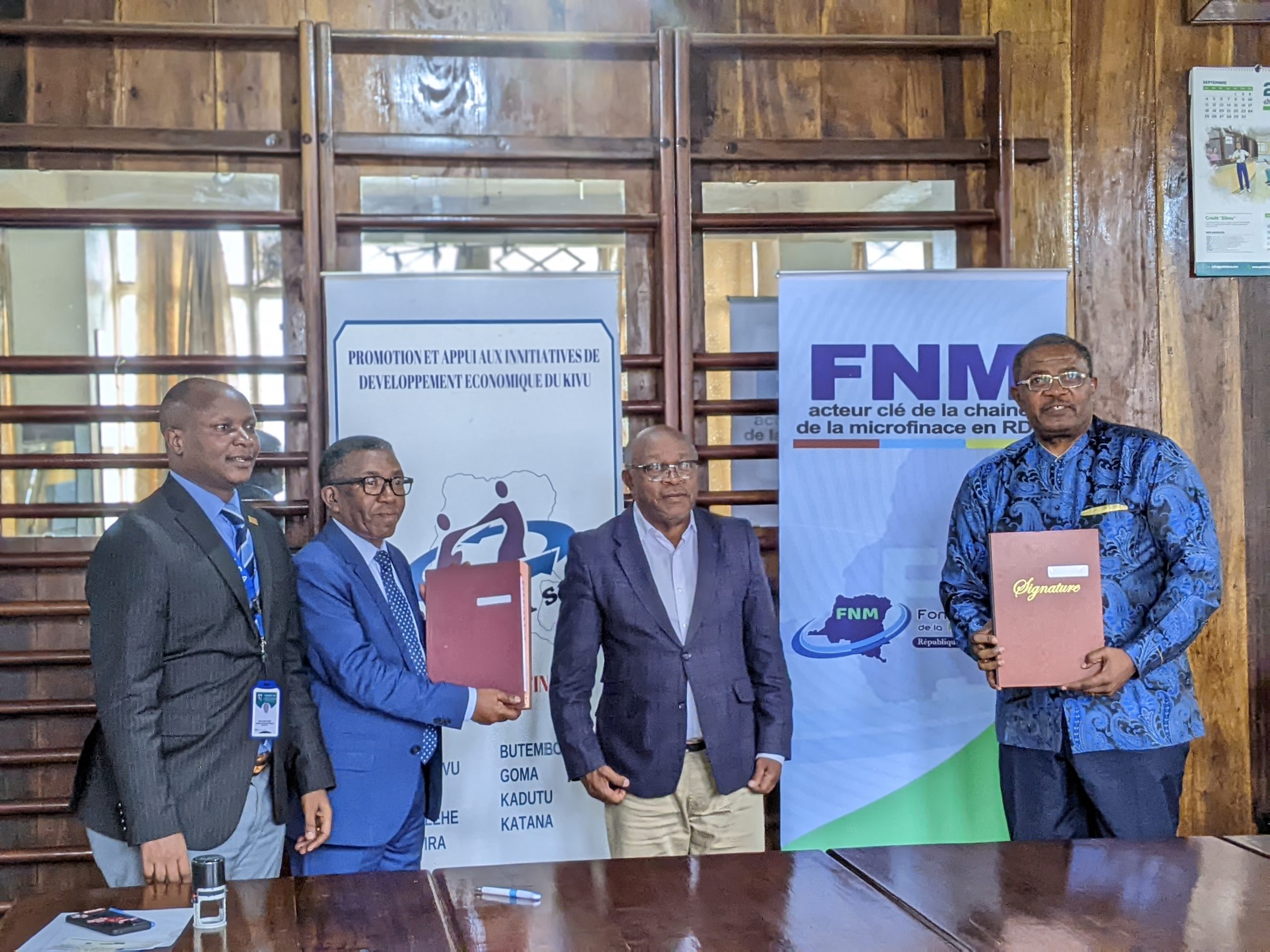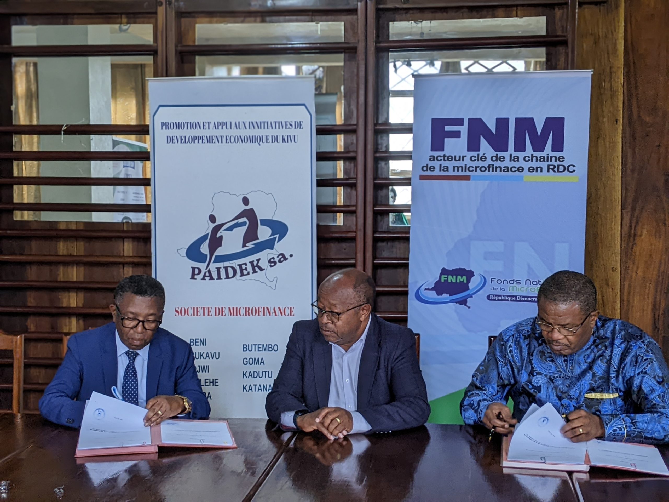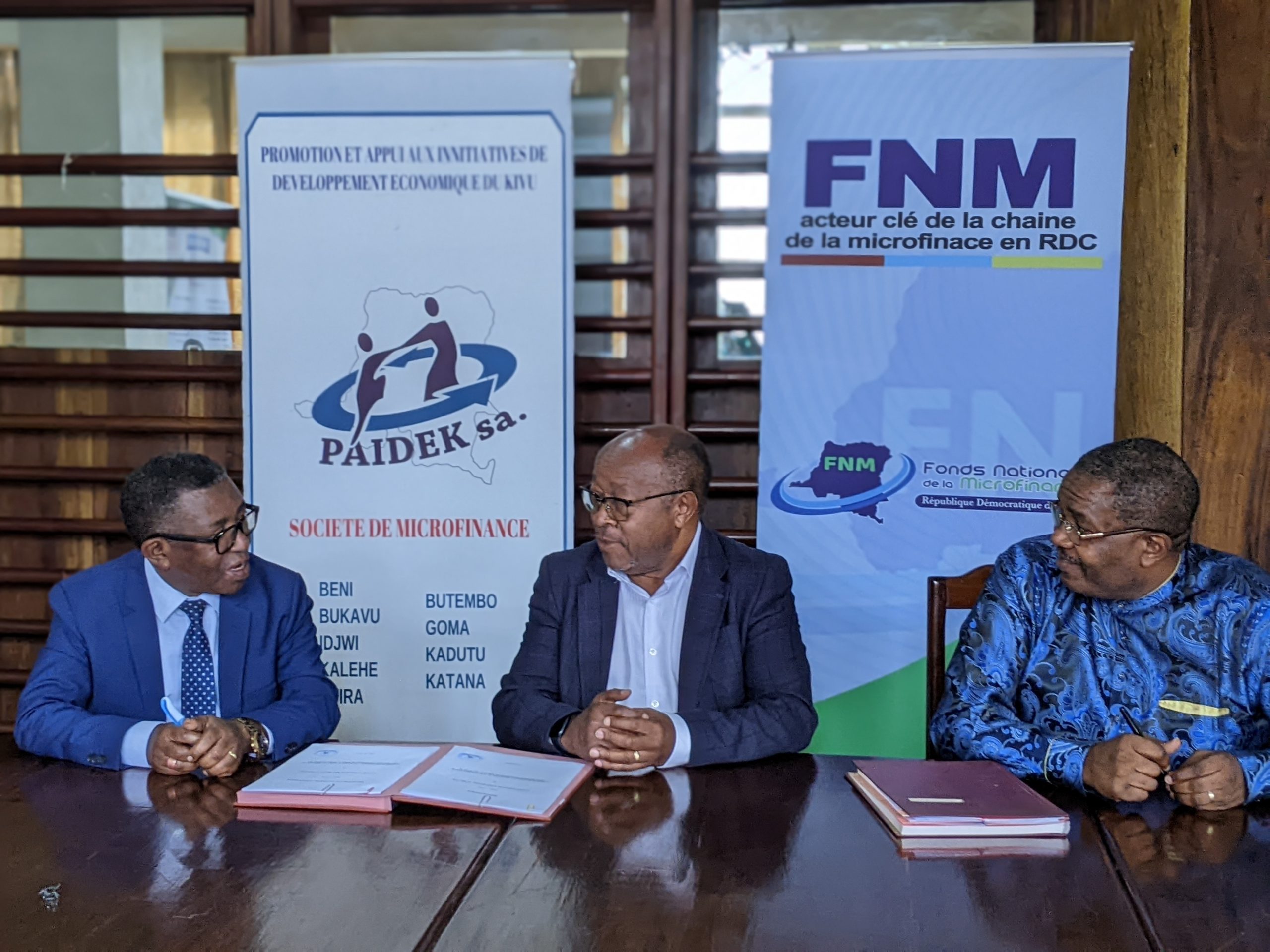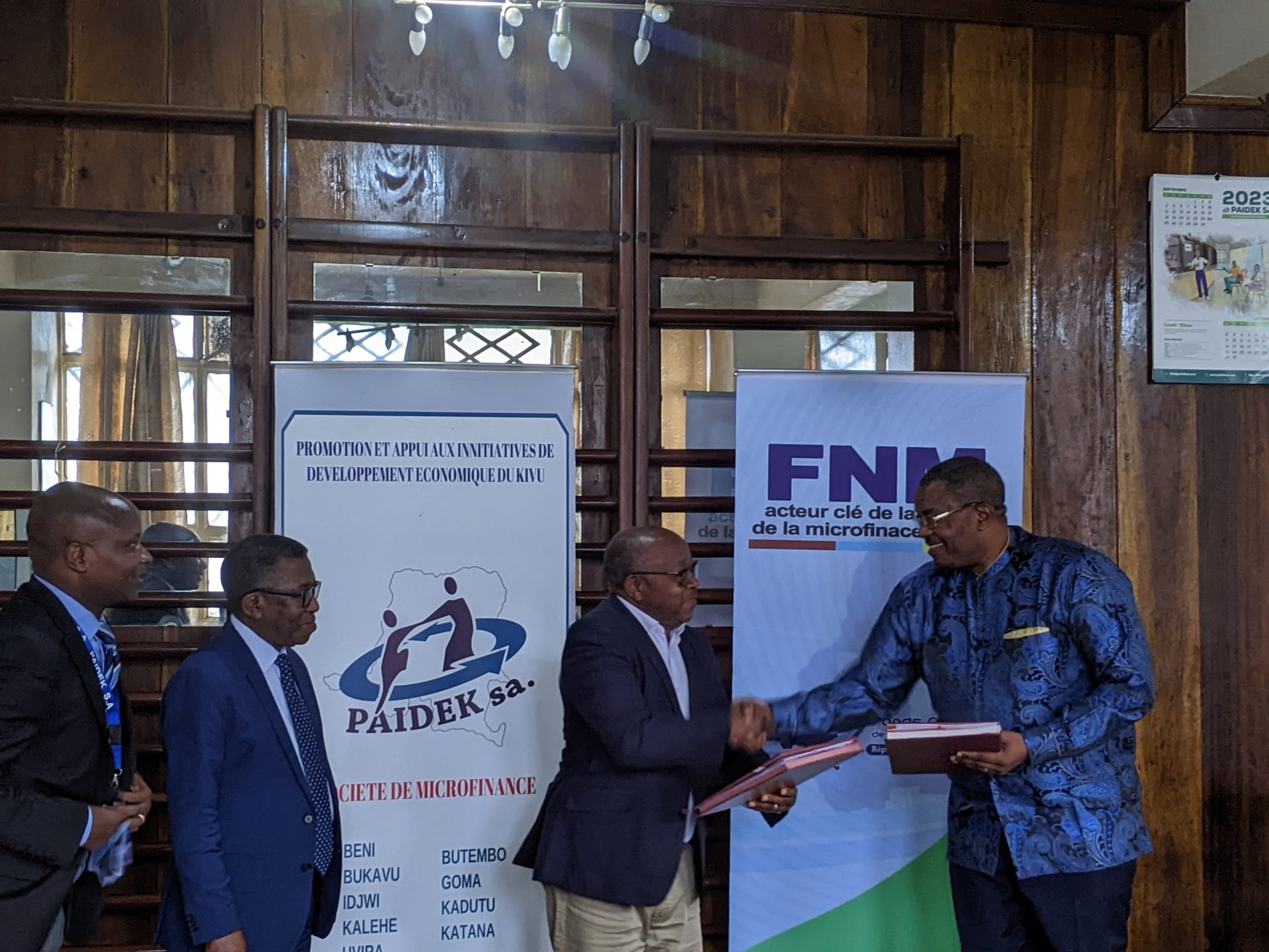 PAIDEK sa représenté par son Directeur Général Monsieur RAMAZANI MUSONGO René et son Président du Conseil d’Administration Monsieur MITIMA MPANANO Rémy ont signé, ce samedi 18 novembre 2023 un contrat de financement avec le partenaire FNM (Fonds National de la Microfinance) représenté par Mr Thierry NGOYI et Madame Françoise NSIKU.